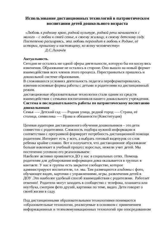 « Использование Дистанционных Технологий В Патриотическом Воспитании Детей Дошкольного Возраста»