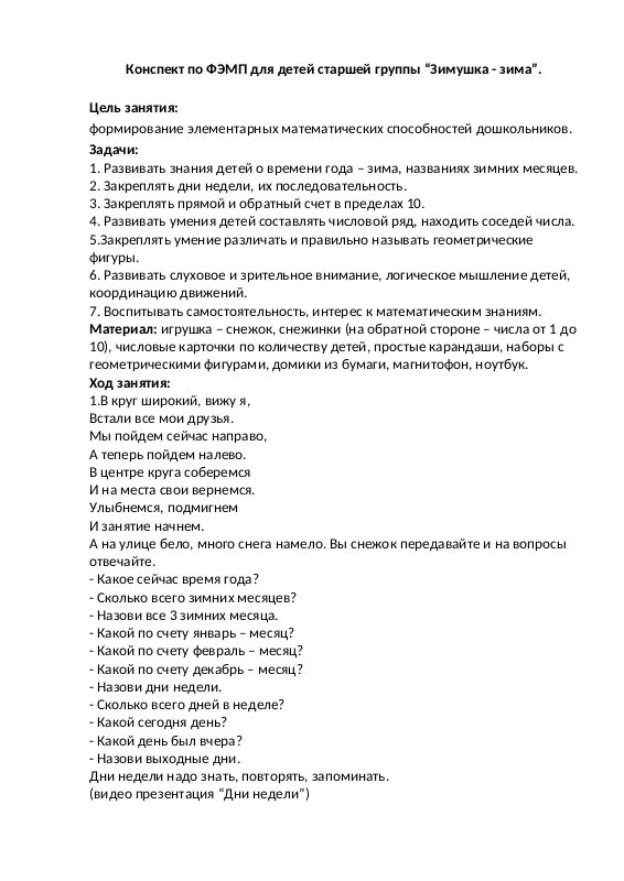 Конспект Занятия По Фэмп В Старшей Группе Зимушка Зима